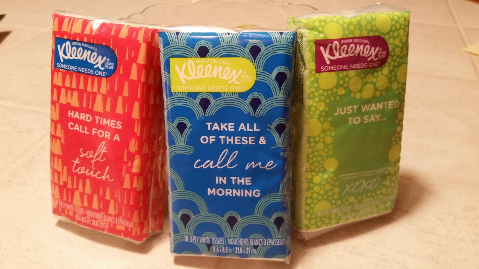 Kleenex and Crowdtap sent me a few packs of tissues to pass out to strangers in need. The packages (pictured above) had adorable little phrases on them, my favorite was "Take all of these and call me in the morning".